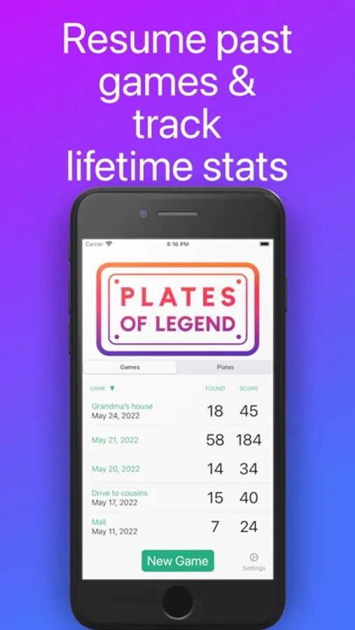 • Keep track of your past games. See what you've found in the past, and which plates you've never seen before.