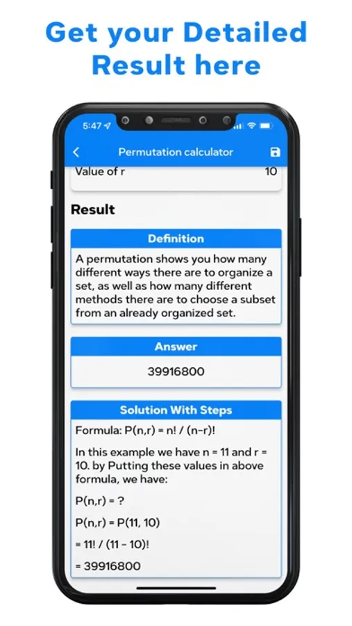 If you are weak in mathematics and unable to solve large numbers! Give a try this Permutation Calculator. Because this app can make your life easy by solving your desired equations step by step.