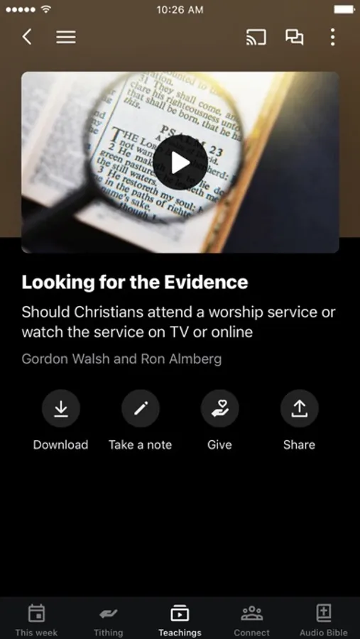 This app will help you stay connected with the day-to-day life of our church. With this app you can: watch or listen to past messages; stay up to date with push notifications; share your favorite messages via Twitter, Facebook, or email; and download messages for offline listening.