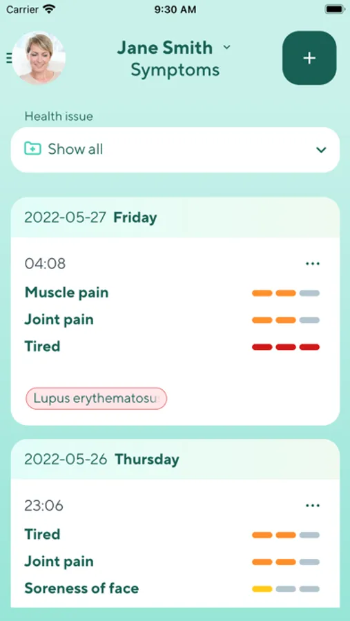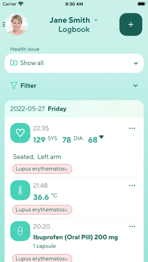 Log all current symptoms to build an overview of how a health issue progresses day by day as well as important vitals such as blood pressure, blood oxygen saturation, and more.