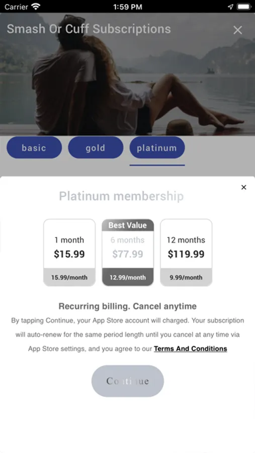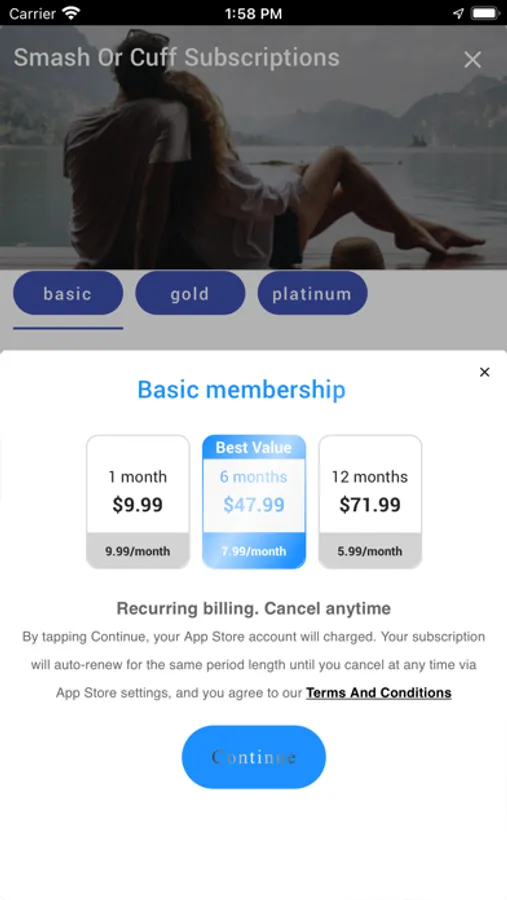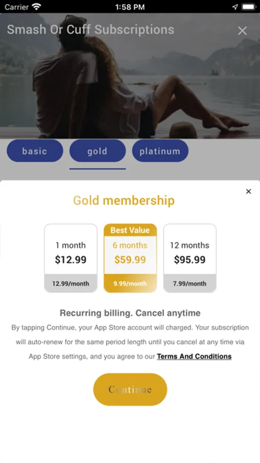 If you choose to purchase the Smash Or Cuff "Basic Membership" or "Gold Membership" or "Platinum Membership" the payment will be charged to your Apple Account at confirmation of purchase. Subscription automatically renews unless auto-renew is turned off at least 24-hours before the end of the current period.