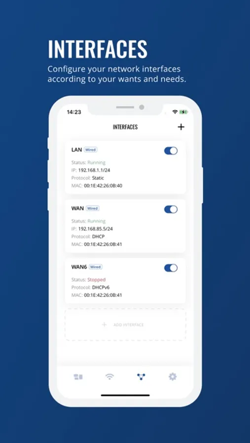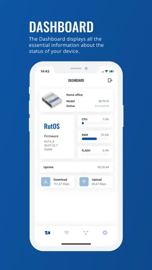 Have complete control and monitor your Teltonika Networks products with this easy-to-use app. It offers a Wi-Fi and device list for wireless connectivity control and Traffic Charts to analyse your internet speed accurately and a Dashboard where you can see all the crucial metrics of connected devices.