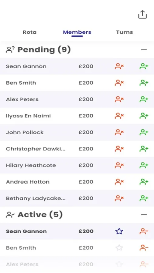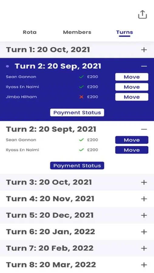 When the Rota starts it will allow you to set who has paid for each turn, and see which members the payment is missing for.
