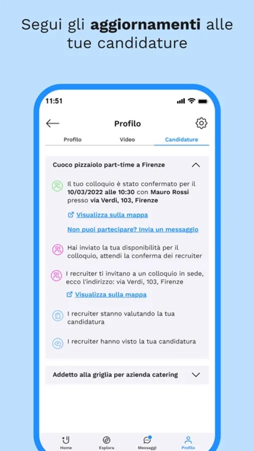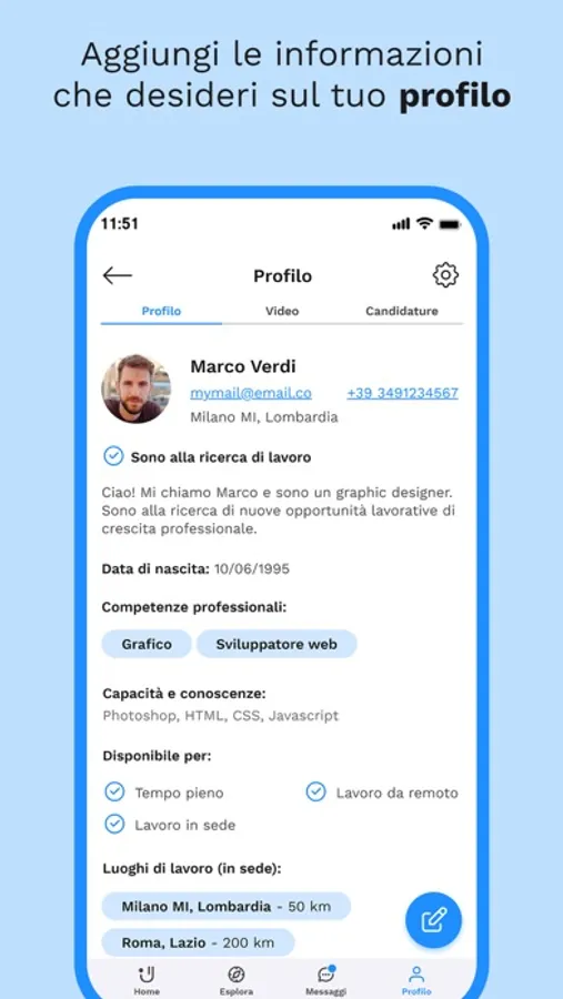 Noi pensiamo che il mondo del lavoro sia fatto anche di relazioni e affinità, per questo abbiamo creato un’applicazione che ti permetta di esprimere te stessa, le tue unicità e il tuo modo di essere. Siamo sicuri che questo sia un passaggio importante per permetterti di trovare l’ambiente lavorativo nel quale poter dare il meglio di te e sentirti appagata.