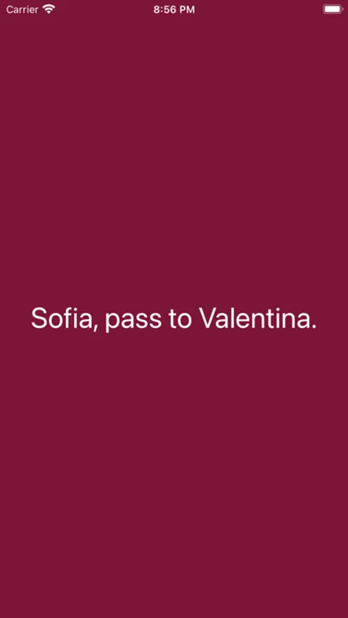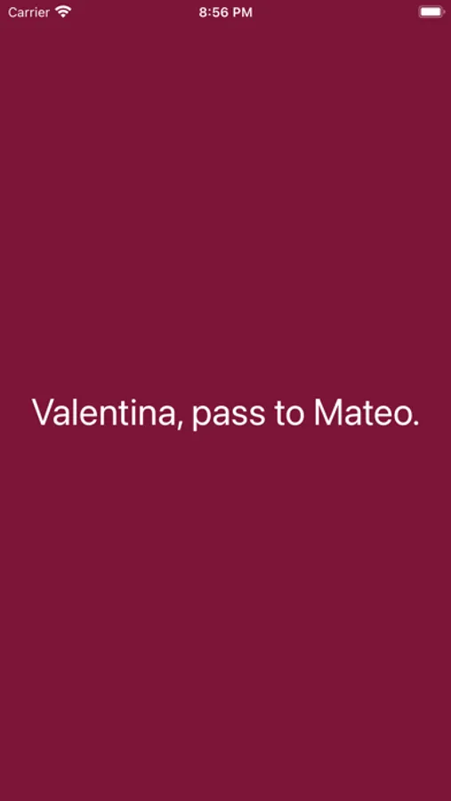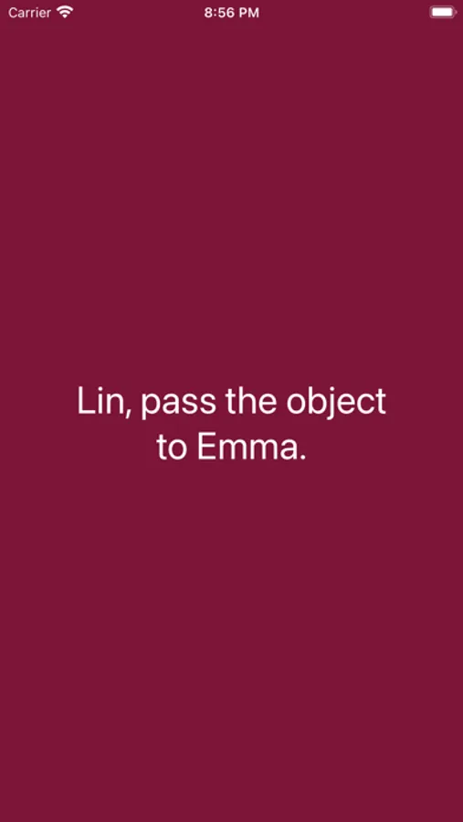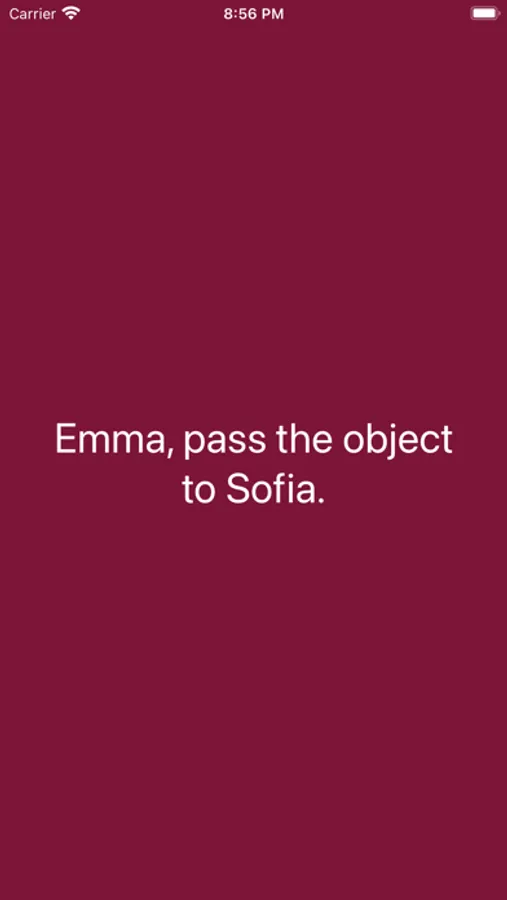 Pass It is a fun party game for a group of 3 or more. First, find an object that you can safely pass to each other. Second, enter the names of the participants. Third, unmute your device. Finally, start a game and obey the spoken commands which instruct someone to pass the object to another player. The commands gradually speed up until it is impossible to keep up! The first player to mess up a command or fumble a pass loses the game. For extended gameplay, play multiple rounds and gradually remove names of players who lost until only two winning players remain. For more difficult gameplay, adjust the settings or move further apart.