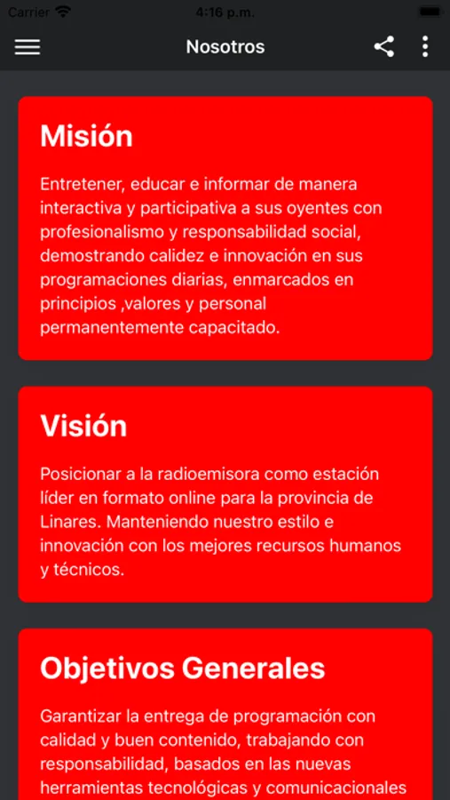 Entretener, educar e informar de manera interactiva y participativa a sus oyentes con profesionalismo y responsabilidad social, demostrando calidez e innovación en sus programaciones diarias, enmarcados en principios, valores y personal permanentemente capacitado.