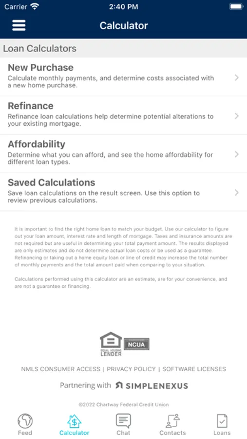 The calculations provided by the Chartway’s Mortgage Express Mobile App are useful in giving you an idea of what homeownership might mean for you. However, please be sure to contact your Chartway Loan Officer for a customized solution tailored to your specific financial situation, needs, and goals. Your Loan Officer can also assist you with any questions you have about your loan and the loan approval process.