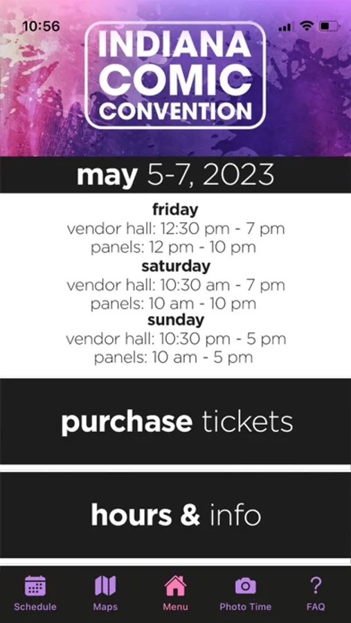 The Indiana Pop Culture and Comic Convention app is your road map to all things ICC! Download the app prior to the event for updates on guests, the event, tickets, Photo Ops, and easy access to our FAQ. Have your schedule ready by adding panels and Photo Ops to your app when times are announced. The app will help guide you during the show by giving you information about Panels, Photo Ops, Tickets, Celebrity Row, Vendor Floor, and more We can't wait to celebrate pop culture and comics with you on May 5-7, 2023 at the Indiana Convention Center.