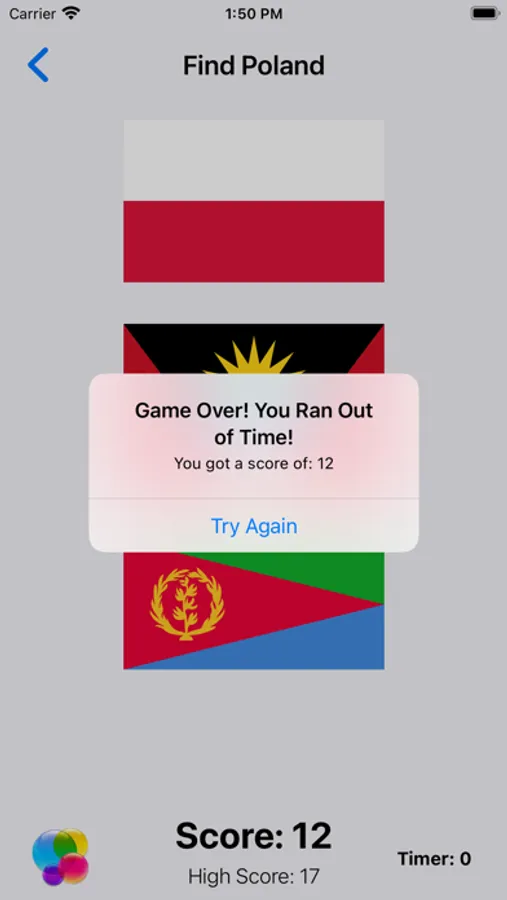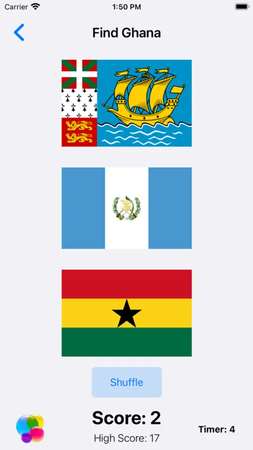 Optionally, you can purchase the ability to skip rounds through the app. When you unlock the skip button, every time you press it, a new set a flags will appear. Skipping flags does not reset or change your timer, so be careful to not run out of time.
