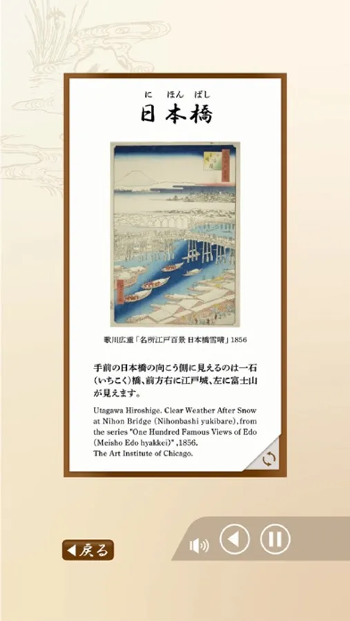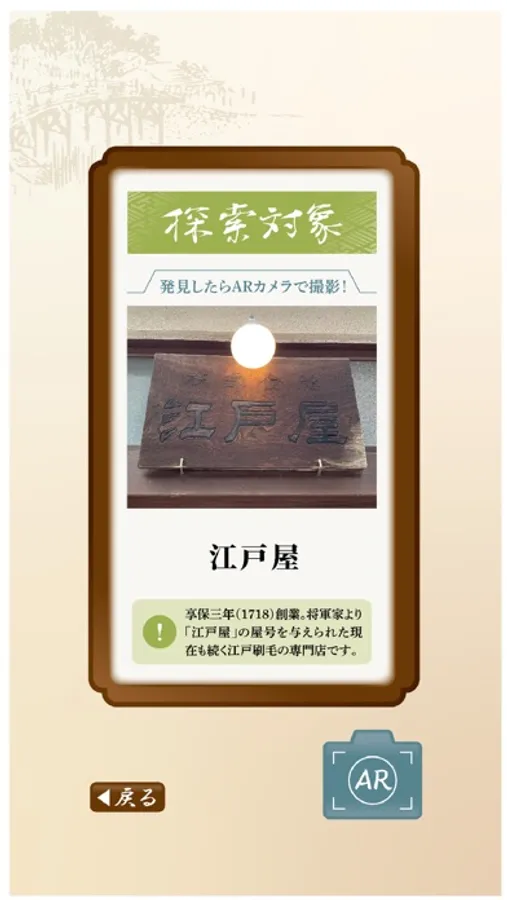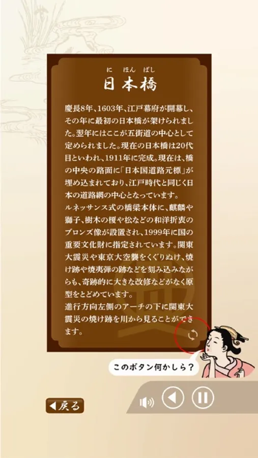 ・アプリのルートマップ上に表示された50か所程度の案内スポットを使用者自らが任意で起動させ、歴史音声案内や、その場所の浮世絵や、図解などを通して、現地を知ることが出来る。