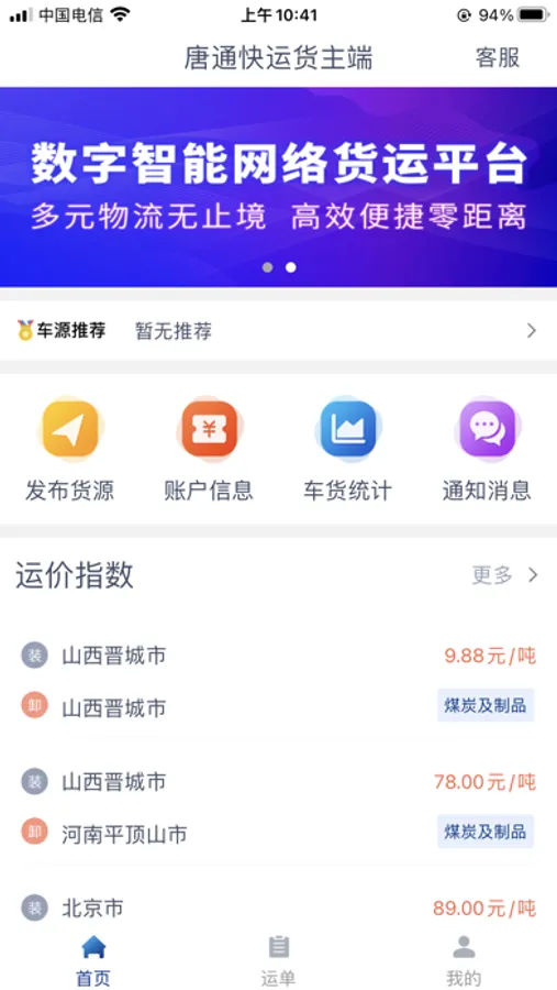 唐通快运是山西唐通科技有限公司旗下公共物流服务平台,面向物流货运领域,为货主和物流商、司机提供在线运力交易和调度管理服务。平台坚持以市场为导向、以客户为中心,依托互联网为货主提供安全方便快捷的一体化服务。通过合理调度降低车辆空驶率、减少司机等待时间,实现快装、多跑、省心、好赚从而提高车辆运行效率,降低运输成本,实现利润最大化。努力打造一个货主放心、司机省心互利双赢的物流平台