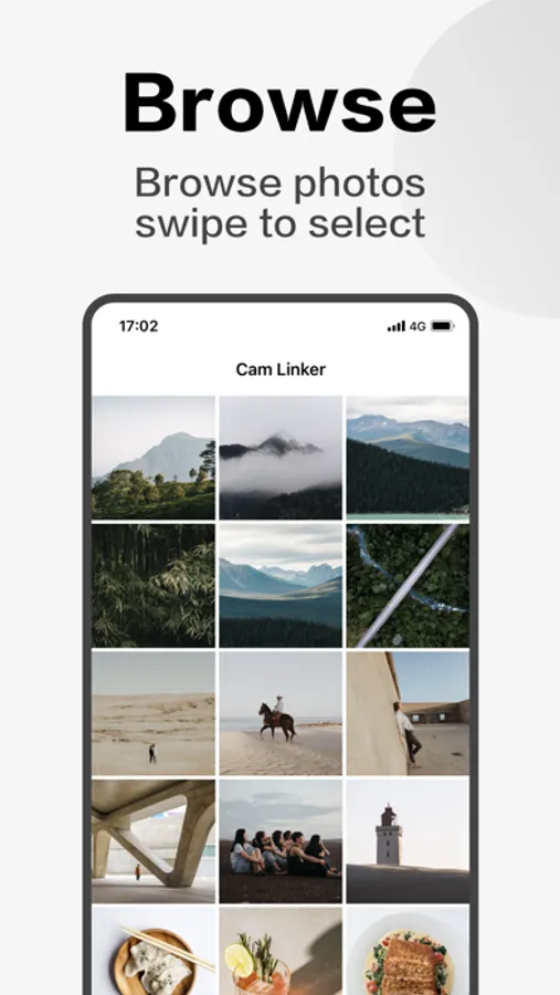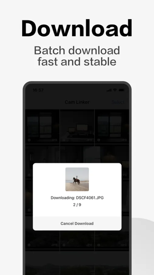 It supports quick camera connection, swipe to select multiple photos, and multitasking concurrent downloads.