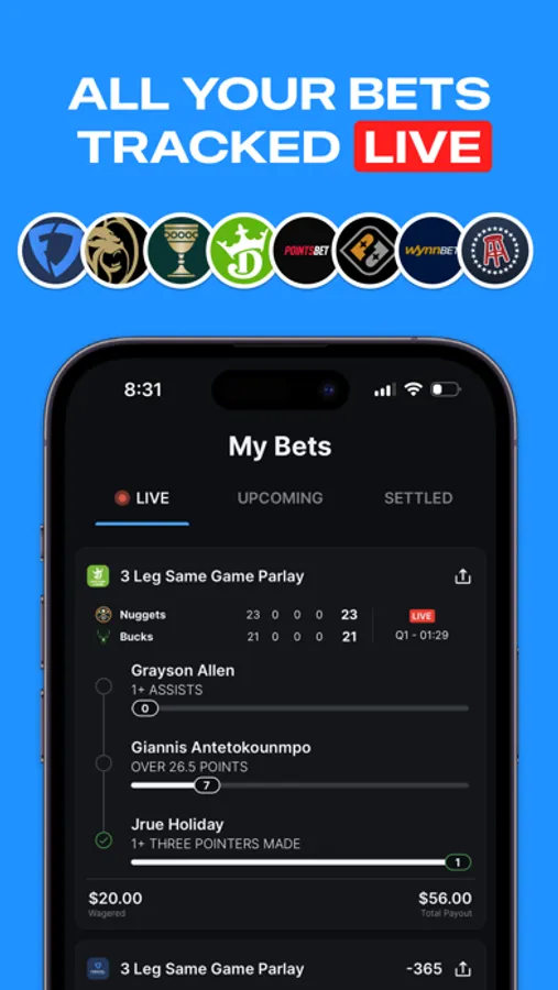 All legs of your bet are tracked in real-time. No more googling to find out how many three pointers, steals, or rushing yards your player is at. Live Tracking is currently supported for the NBA, NFL, NCCAF, and NCAAB. More leagues coming soon! All legs of your bet are tracked in real-time. No more googling to find out how many three pointers, steals, or rushing yards your player is at.