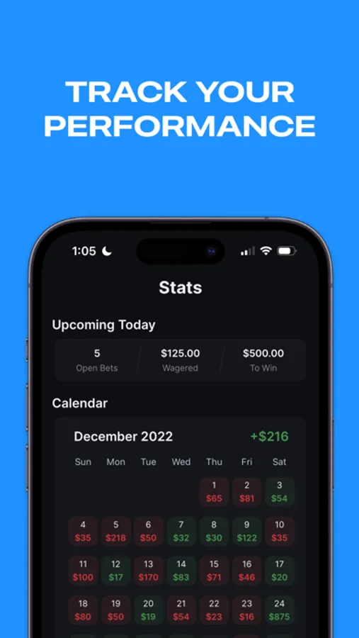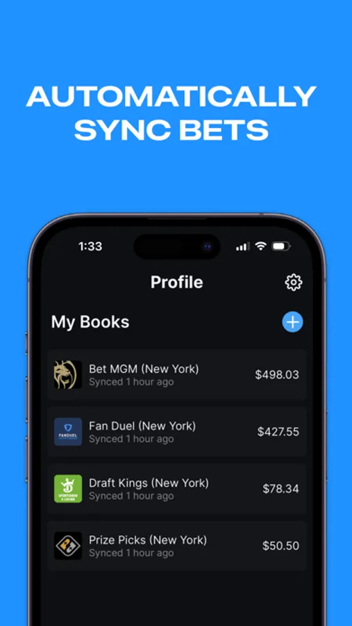 Your bets are automatically synced and tracked. Bet Tracker currently supports Fanduel, Draftkings, PrizePicks, Caesars, BetMGM, PointsBet, Barstool, and WynnBet. More books will be integrated in the future!