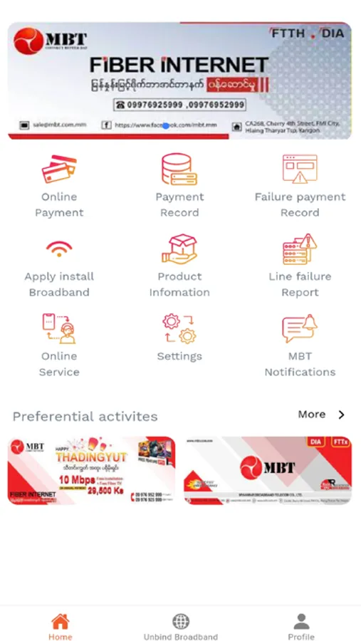 MBT , with its leading-edge technology and professional team, is specialized in network solutions providing to enterprises, government bureaus, NGO institutions, individuals etc. Granted with the network service license, MIC permit, MBT has established its self-owned and self-managed nationwide transmission and IP network. We are now ready to offer the most comprehensive network solutions to our clients with lower cost and better service. Besides, MBT has always been taking social responsibility and doing contribution to the benefits of Myanmar and its people. Together, Let’s build a better connected Myanmar!