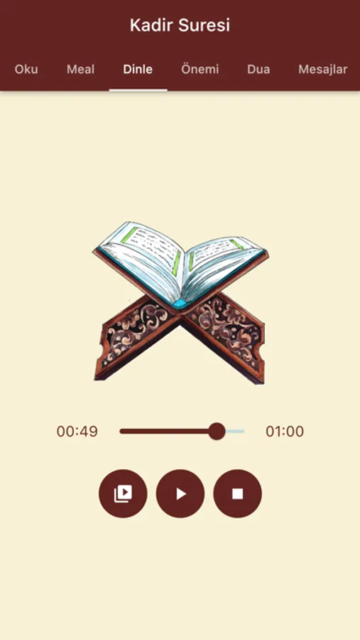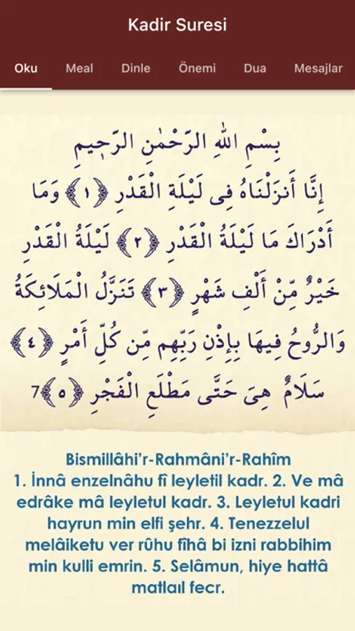 Kadir Suresi dinleyebilir aynı zamanda Kadir Suresi ezberleyebilirsiniz. Kadir Suresi indir internetsiz olarak çalışmaktadır. Kadir Suresi sesli indirmek için uygulamamızı denemelisiniz. Kadir Suresi duaları ile de duanızı yapabilirsiniz.