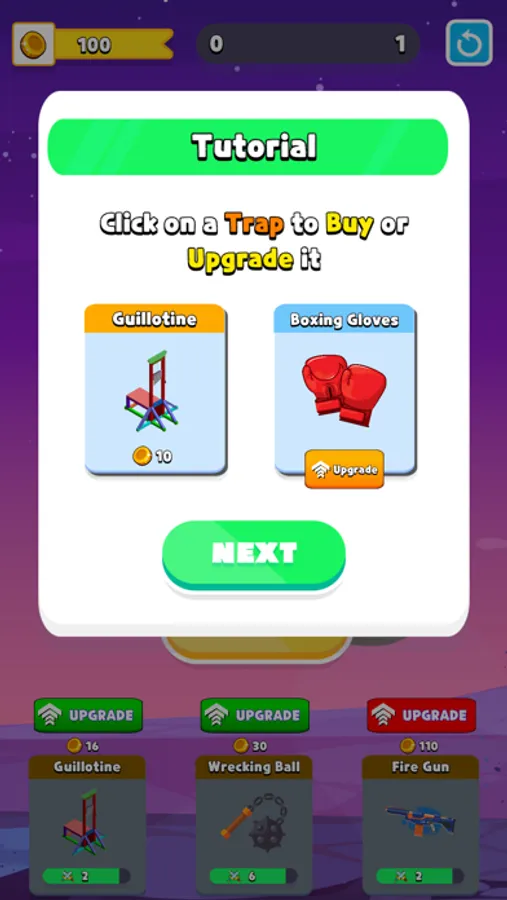 Buy and Upgrade your traps to get the strongest collection of deadly obstacles.