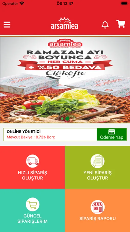 Arsamiea çiğköfte'nin bayilerine satış yapabildiği ürünleri kredi kartı ile ödeyerek sipariş verebildiği, aynı zamanda cari hesaplarına işleme yaparak ödeme yapabildiği profesyonel bayi paneli. Arsamiea bayi uygulamamızı kullanarak çeşitli etkinliklerden haberdar olabilir, kampanyalardan yararlanabilirsiniz. Sepetinize ürünler ekleyip daha sonrası için sepet biriktirebilir, ileri tarihte sepetinizdeki siparişinizi tamamlayabilirsiniz.