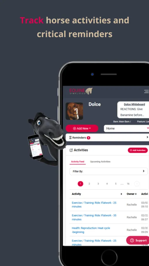 - Add one time and recurring reminders. Checking off reminders automatically adds the activity to the horse’s history
