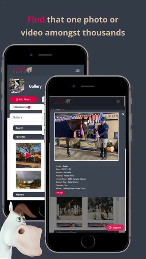 - Search to find “the one”. Search from horse, date, person, activity, horse show, custom tags, favorite and album