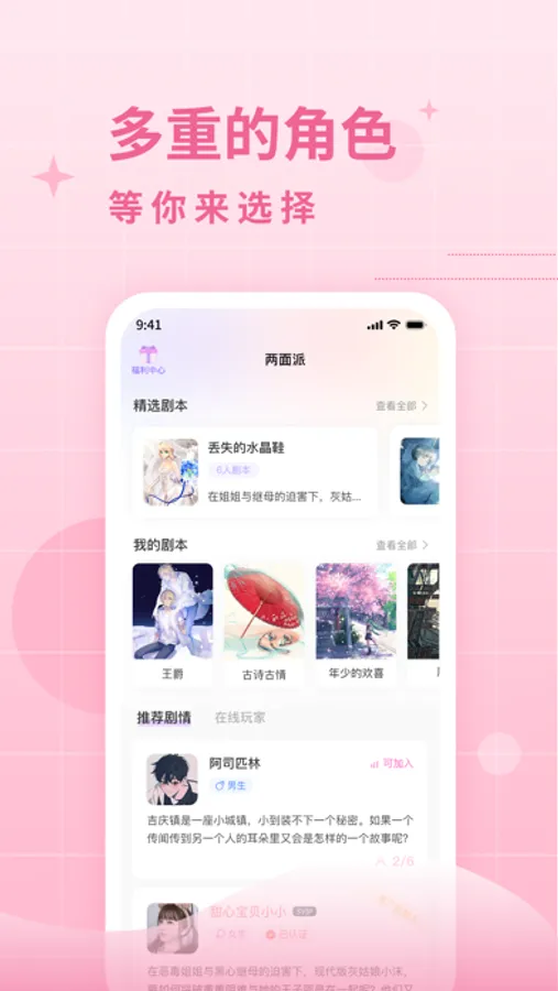 两面派 是千万角色扮演剧情聊天聚集地,在这里你可以轻松的找到兴趣相投的朋友,一起畅享在不同的世界里,还可以一起组队约玩。