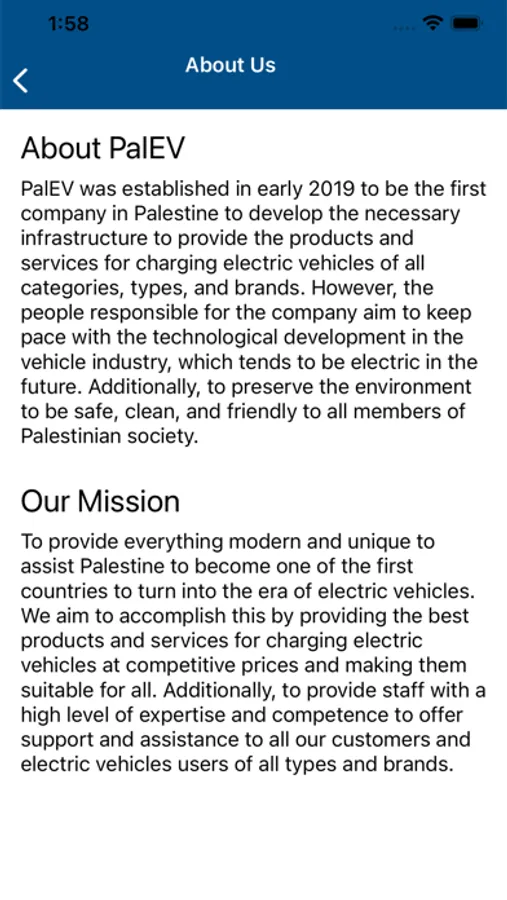 PalEV was established in early 2019 to be the first company in Palestine to develop the necessary infrastructure to provide the products and services for charging electric vehicles of all categories, types, and brands. However, the people responsible for the company aim to keep pace with the technological development in the vehicle industry, which tends to be electric in the future. Additionally, to preserve the environment to be safe, clean, and friendly to all members of Palestinian society.