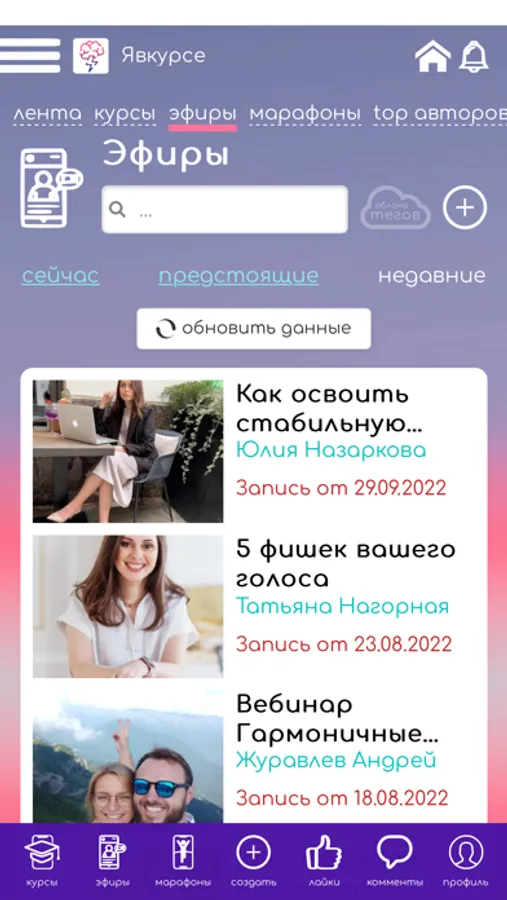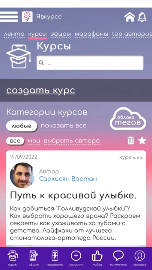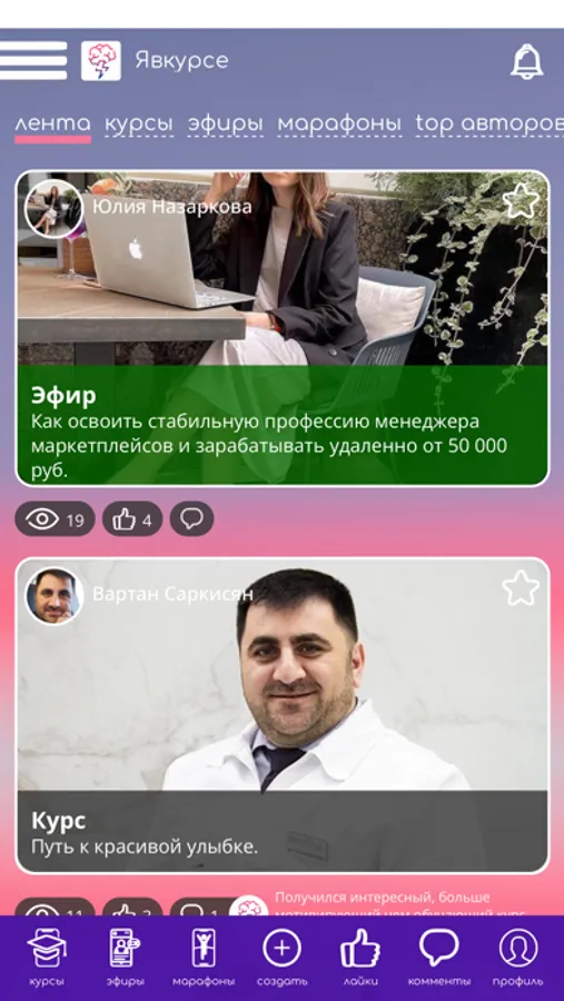 Явкурсе это видео курсы в прекрасном качестве от специалистов в своём деле! Сейчас видео курсов уже 700, а каждый месяц Мы добавляем по 100 новых. Кроме этого частые эфиры и вебинары на различные развивающие темы, а также марафоны от крутых спецов! Начните получать поток знаний, в лёгкой и простой форме, в уже привычной для всех форме – короткие видео без воды, только о самом главном по каждой теме! Это не IT курсы, это курсы про жизнь и бизнес, от того как развить свой личный бренд до того как поставить свой голос!