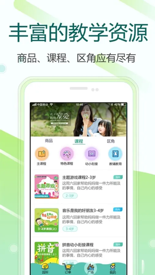 设有园所、订单、广场、我的四大功能模块。【园所】用于芳草教育代理商管理园所信息。【订单】用于展示芳草教育园丁端所来订单信息,方便代理商进行处理。【广场】用于展示芳草教育商品、课程和区角装备等丰富的教学资源。【我的】包含个人信息编辑、【设置】等功能。
