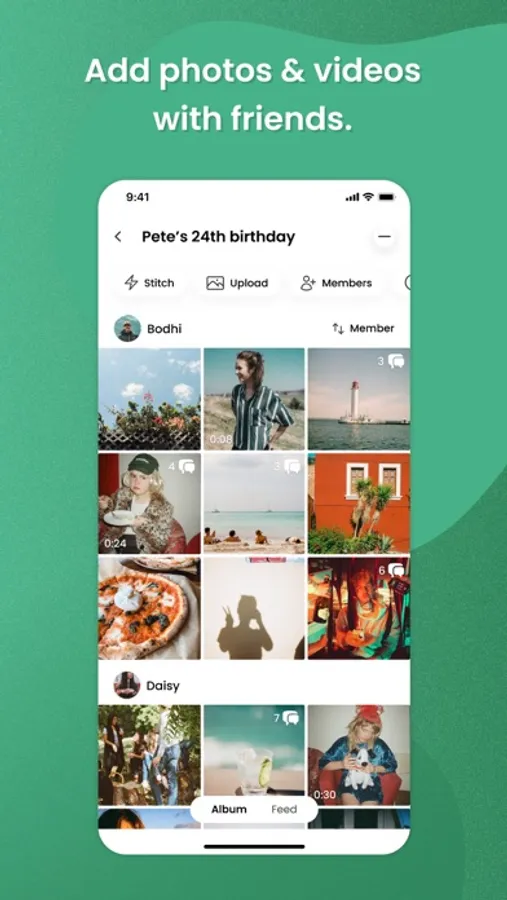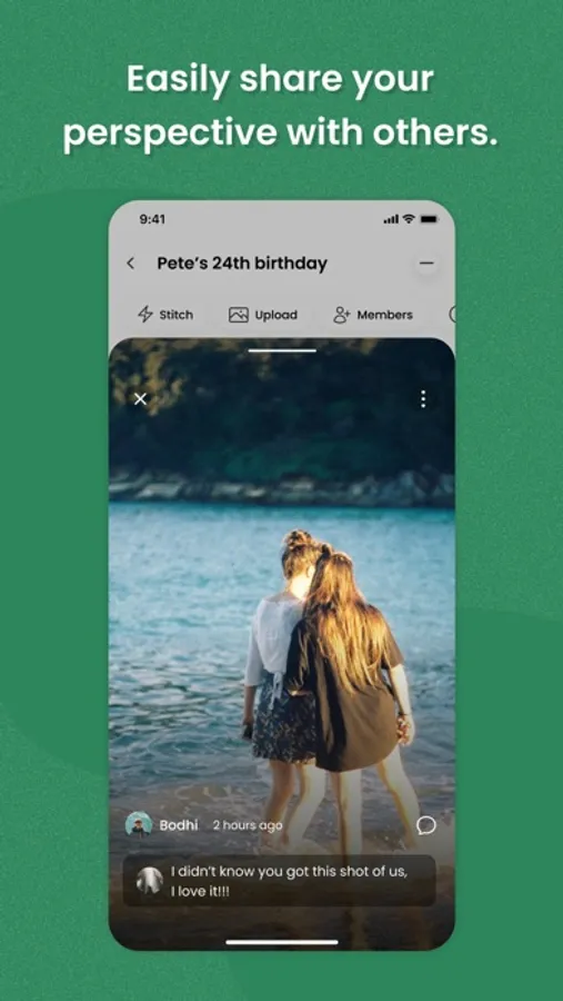 Stitches make it easy for everyone to share their unique perspective of an event - you each only need to take a single photo, and then all of your group’s pictures are automatically stitched together into a fun, candid video.