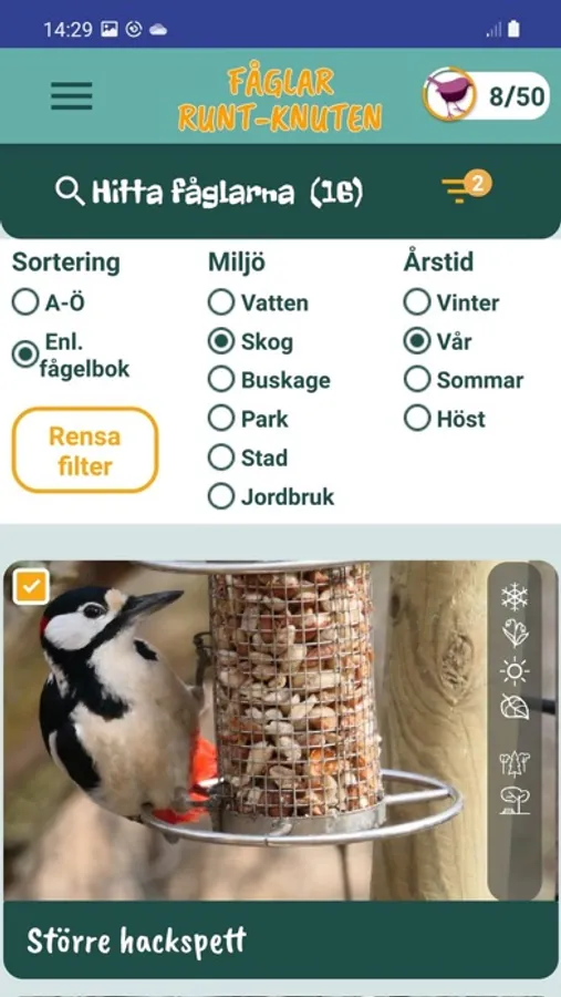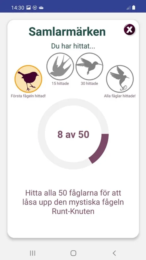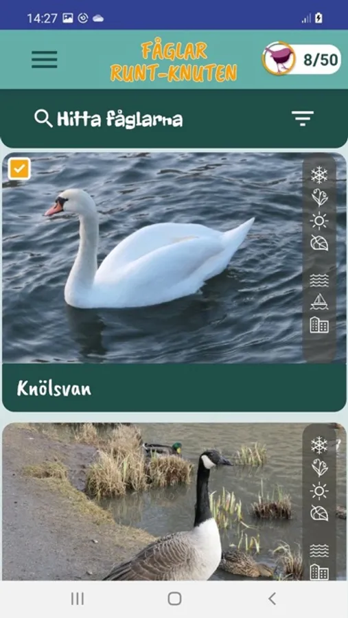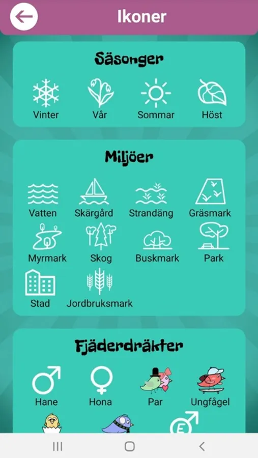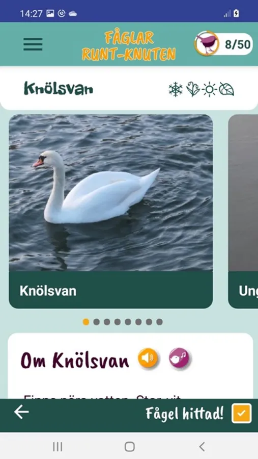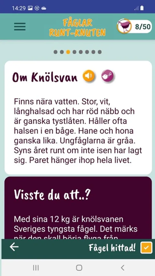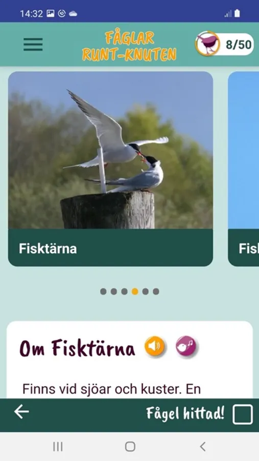 50 vanliga fåglar presenteras med olika bilder på varje fågelart samt med en beskrivande åldersanpassad text som också kan lyssnas av eftersom en del barn ännu inte förmodas kunna läsa. Fågelns läte kan också spelas upp om man vill bekanta sig med det eller kontrollera om det var den fågeln man hörde tidigare.