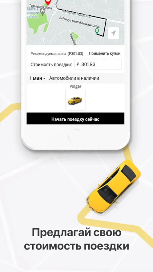 Вызвать машину просто — заполните в приложении поля «Откуда», «Куда» и «Стоимость», которую определяете вы. Свободный водитель поблизости подвезет вас в любую выбранную вами точку.