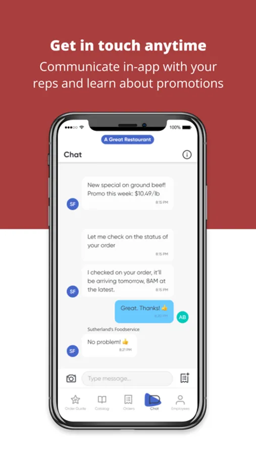 - Get in touch anytime: communicate directly with your Sutherland's Foodservice rep in the app