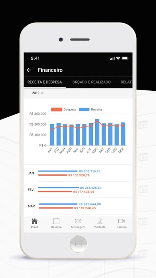 - comparativo de orçado versus realizado (gráficos e detalhamento)