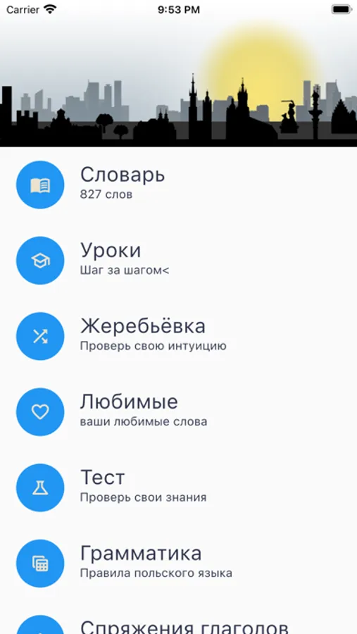Приложение «Польский - изучай язык» содержит такие темы как: