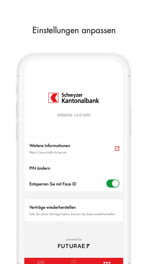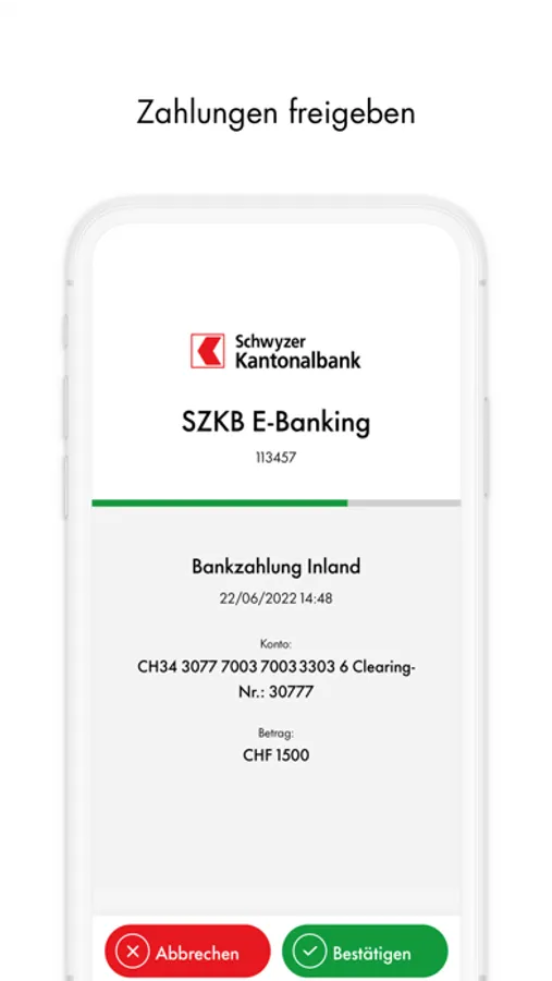 Voraussetzung für die Nutzung der App ist ein E-Banking Vertrag der SZKB, der für «SZKB Secure» freigegeben ist. Nachdem Sie die App auf Ihrem Gerät installiert haben, melden Sie sich mit Ihrer Vertragsnummer und Ihrem persönlichen Passwort im E-Banking an. Auf Ihrem Smartphone oder Tablet erscheint eine Meldung, die Sie auffordert, die Anmeldung zu bestätigen. Zusätzlich muss die Anmeldung mit einem biometrischen Verfahren wie Touch ID oder Face ID bestätigt werden, falls dies auf Ihrem Smartphone oder Tablet eingerichtet ist. Ansonsten werden Sie zur Eingabe Ihres persönlichen PIN-Codes für die App aufgefordert. Danach gelangen Sie direkt ins E-Banking.