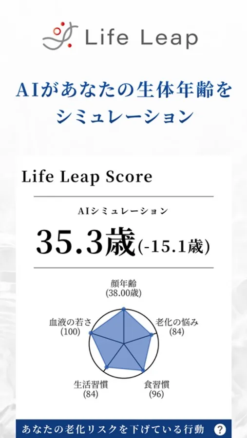 生活習慣や食生活、顔写真、歩行データから、あなたの生体年齢をシミュレーションします。