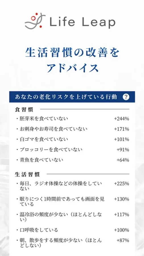 老化リスクを上げたり下げたりする習慣をAIカウンセリングで指摘します。