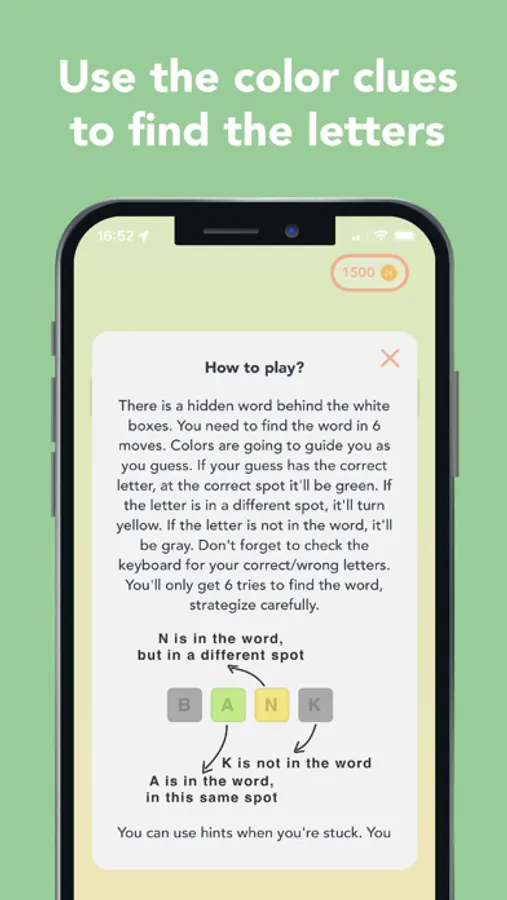 You can use hints when you're stuck. You can either remove 3 wrong letters from the keyboard or choose to reveal one letter from the hidden word.