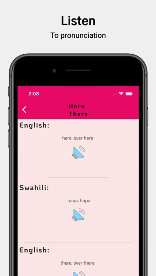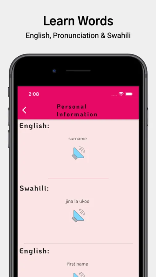 • In every lesson, you can listen to the Swahili word pronunciation as well as see Swahili word in english language.