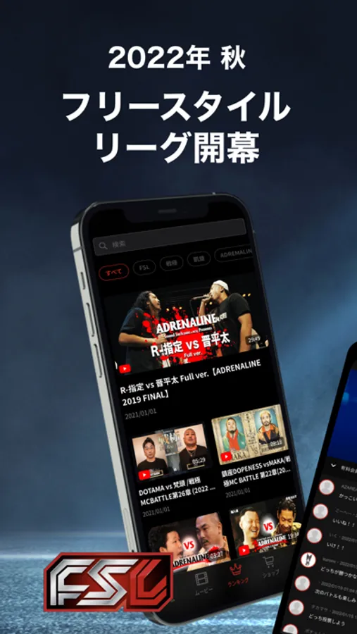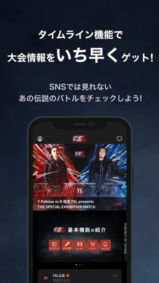 また、FSLオフィシャルアプリをダウンロードすることで、FSL主催のエキシビジョンマッチイベントの独占視聴が可能。さらにはアプリに搭載された投票機能でバトルの勝敗を視聴者自らがジャッジ! バトル会場にいなくてもバトルイベントに参加ができる臨場感を味わうことができます。