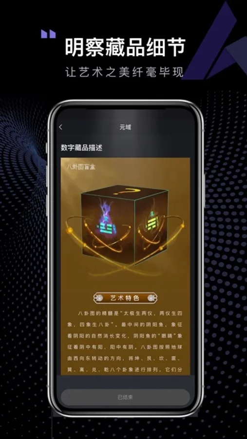 你可以在元域 App里购买到唯一的、不可篡改、不可分割、不能替代的数字藏品,你的权益将被永久记录在区块链上。每个画面、视频或模型,都将变得真实而稀缺。在这里,你将体验到数字收藏艺术的乐趣。