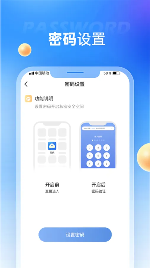 √ 自定义密码:没有你的密码,任何人无法开启应用访问隐私照片/视频