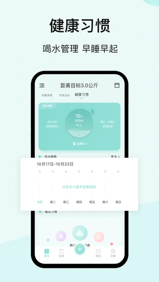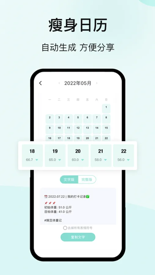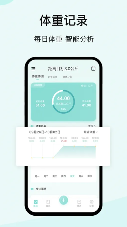 我们围绕体重管理,提供体重记录、体重目标设定管理、体重趋势变化及分析,减肥饮食食谱推荐、运动健身课程跟练打卡记录,记录你的每一次改变。