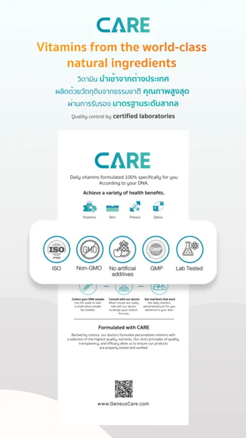 Unlock your highest health potential with supplements designed especially for you. Backed by innovative DNA technology, CARE service tailors your daily supplements formula based on your DNA: a blueprint of your life ensuring you will receive all the micronutrients denoted by your genes.