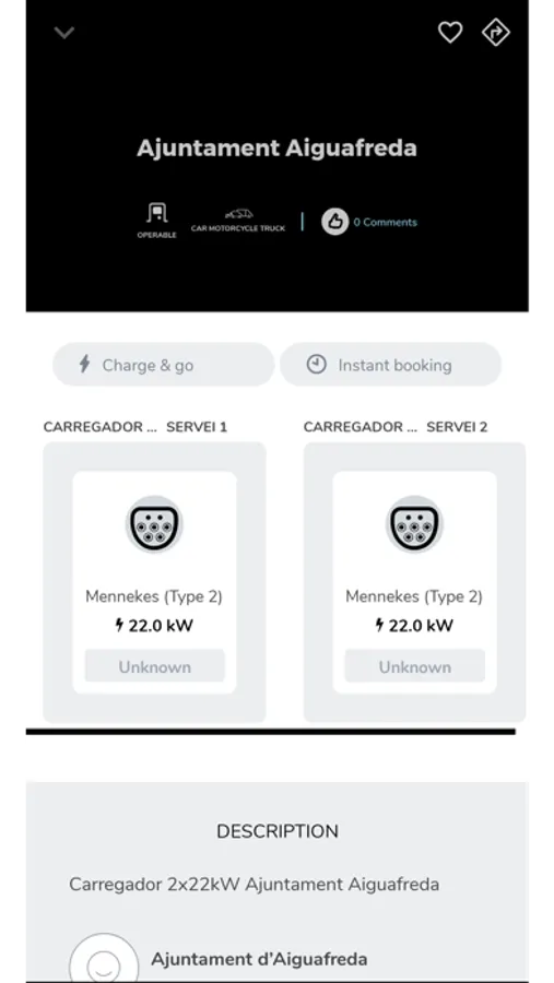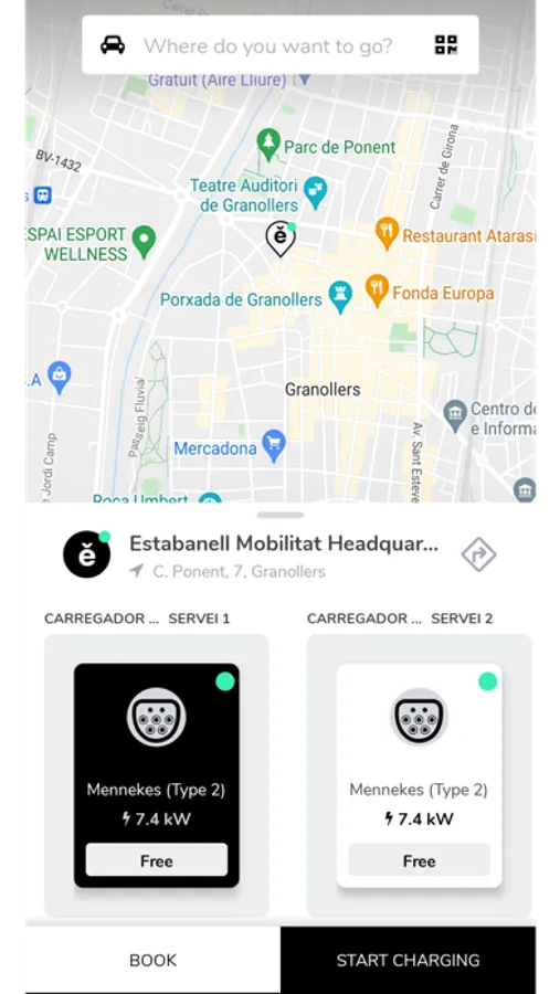 Es mostra la ubicació, la informació i l'estat dels diferents carregadors, permet al client activar-los i iniciar una càrrega, reservar els carregadors. Mostra gràficament el procés en temps real.
