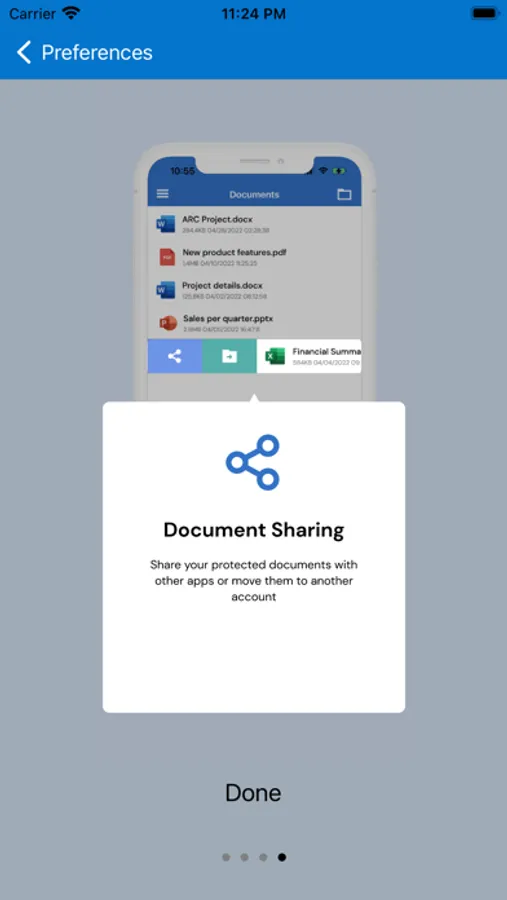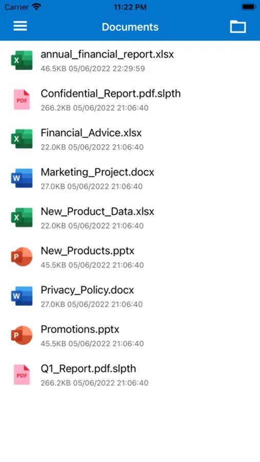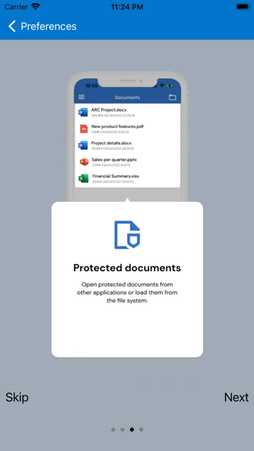 SealPath Document Viewer registers itself to the file types supported by the SealPath protection (Office, Pdf, Txt , Rtf , Xps and images) and additionally allows to visualize Office and Pdf documents without protection. The documents displayed in SealPath Document Viewer are temporarily stored on the device, with strong encryption, in order to be displayed later, when there's no connection to the Protection Servers (offline mode).