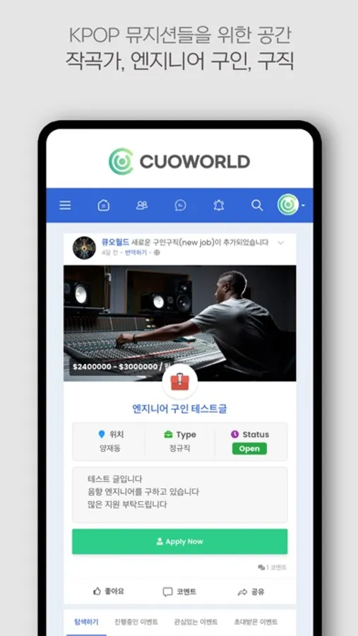작곡, 작사, 믹싱, 마스터링 등 한국에서 음악을 만드는 모든 사람들을 위한 소셜네트워크 입니다.