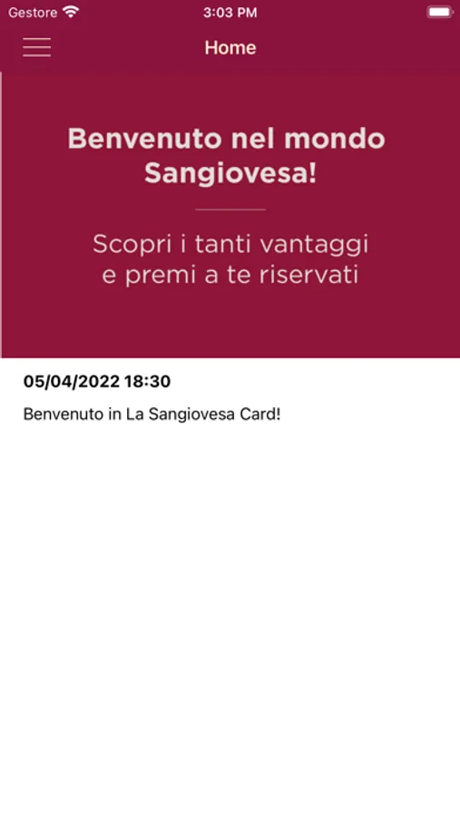 Con l'app La Sangiovesa Card potrai tenere sotto controllo il tuo saldo e tutti i movimenti della Card. Potrai inoltre ricevere le nostre comunicazioni per essere sempre aggiornato su promozioni, novità e vantaggi esclusivi, riservati agli iscritti. Ti aspettiamo!