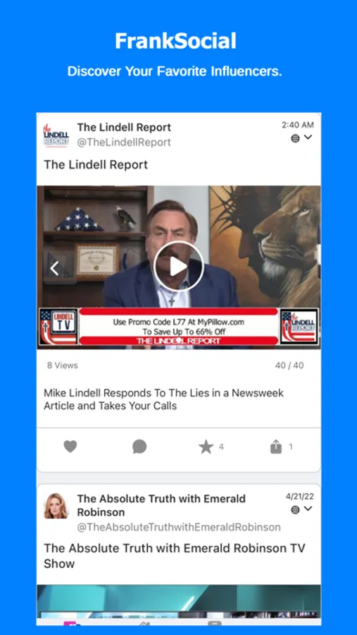 FrankSocial, the voice of free speech, is the platform for Americans who want to defend life, liberty, and freedoms that have marked America as the longest-running Constitutional Republic in the world. On FrankSocial, you can post videos, distribute news and information, and find community and fellowship with like-minded Americans. FrankSocial is a home for major influencers, micro-influencers, and average Americans who want to share in the constitutional right of freedom of speech and expression. We hope you will join our community.