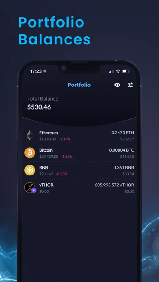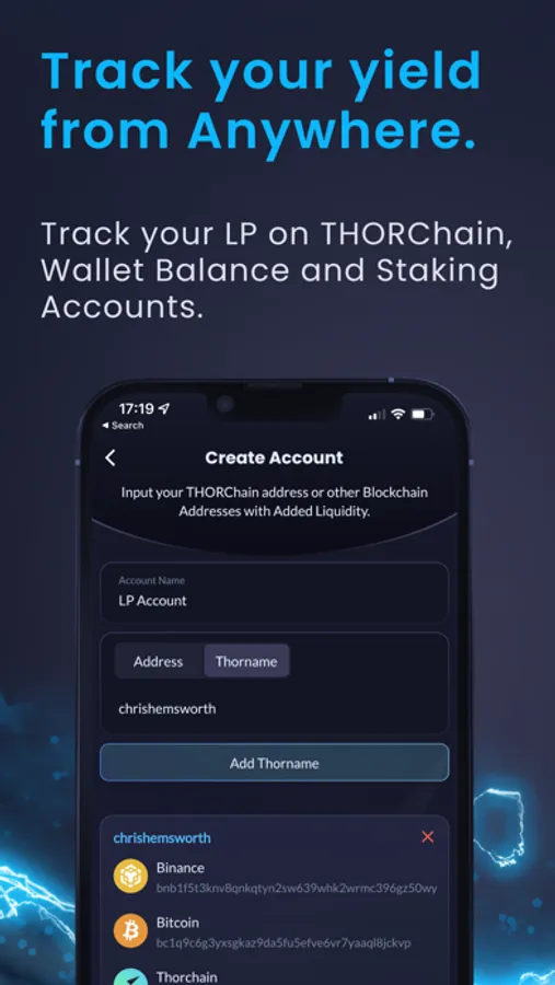 The App currently supports BTC, ETH, LTC, BCH, BNB, DOGE, ATOM and THORChain Addresses but many more chains are coming soon.